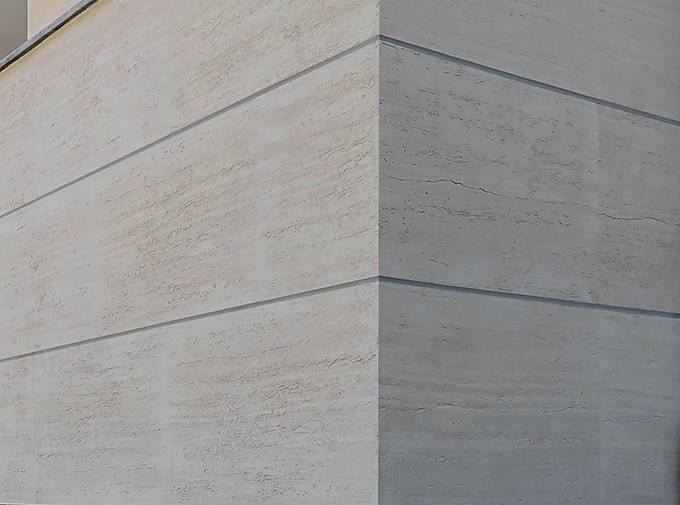 久石研发的洞石风格贴片石颜色丰富,纹理独特,更有特殊的孔洞结构,疏密有致、凹凸和谐,有着良好的装饰性能,同时具有优良的安全性,使得大面积应用外墙成为可能。